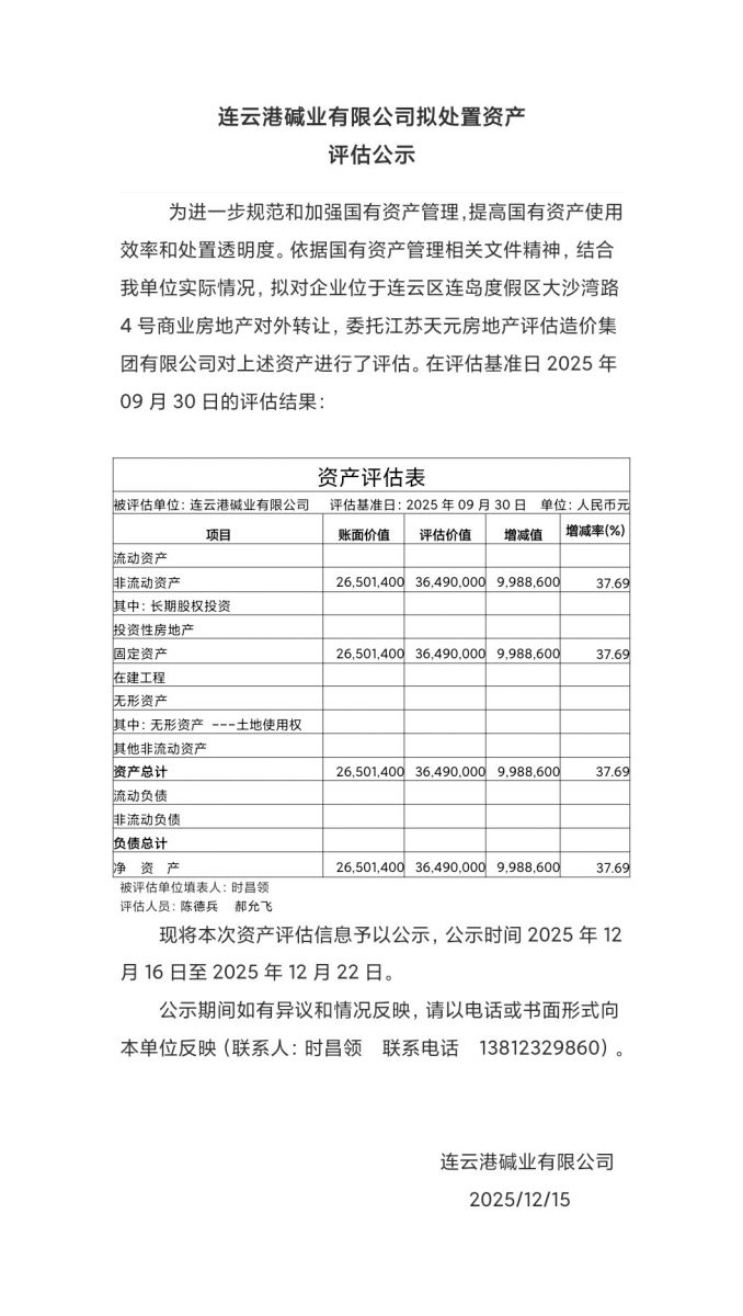 連云港堿業(yè)有限公司擬處置資產(chǎn)位于連云區(qū)連島度假區(qū)大沙灣路4號商業(yè)房地產(chǎn)資產(chǎn)評估公示