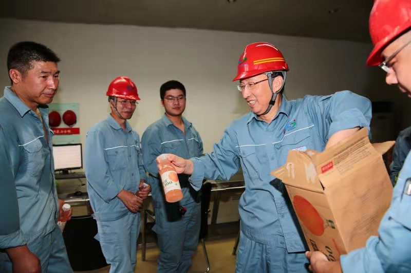公司領導每到一處,親手將一瓶瓶清涼飲品送到大家手中,與現場人員一一握手,感謝大家在炎炎夏日仍不辭辛勞、堅守崗位,為全面完成各項目標任務所作出的奉獻,并叮囑他們在堅守崗位的同時注意安全生產,做好防暑降溫工作。他要求各單位要堅持“生命至上、安全發展”的理念,把各項安全生產防護措施落實落細,切實保障員工的身體健康,確保各項生產作業順利進行。