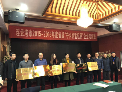12月11日下午,連云港市2015-2016年度省級“守合同重信用”企業培訓班在明珠大酒店舉行,會議進行了授牌儀式,我公司榮獲省級“守合同重信用”單位。