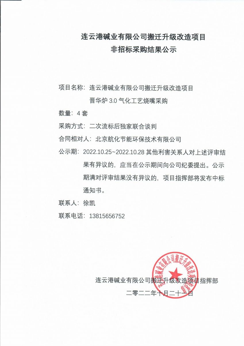 晉華爐3.0氣化工藝燒嘴非招標采購結果公示