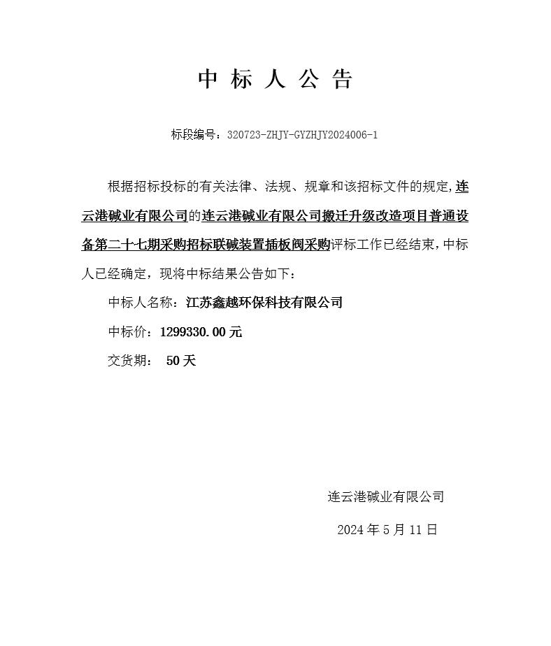 搬遷升級改造項目普通設備第二十七期采購招標聯堿裝置插板閥采購中標人公告